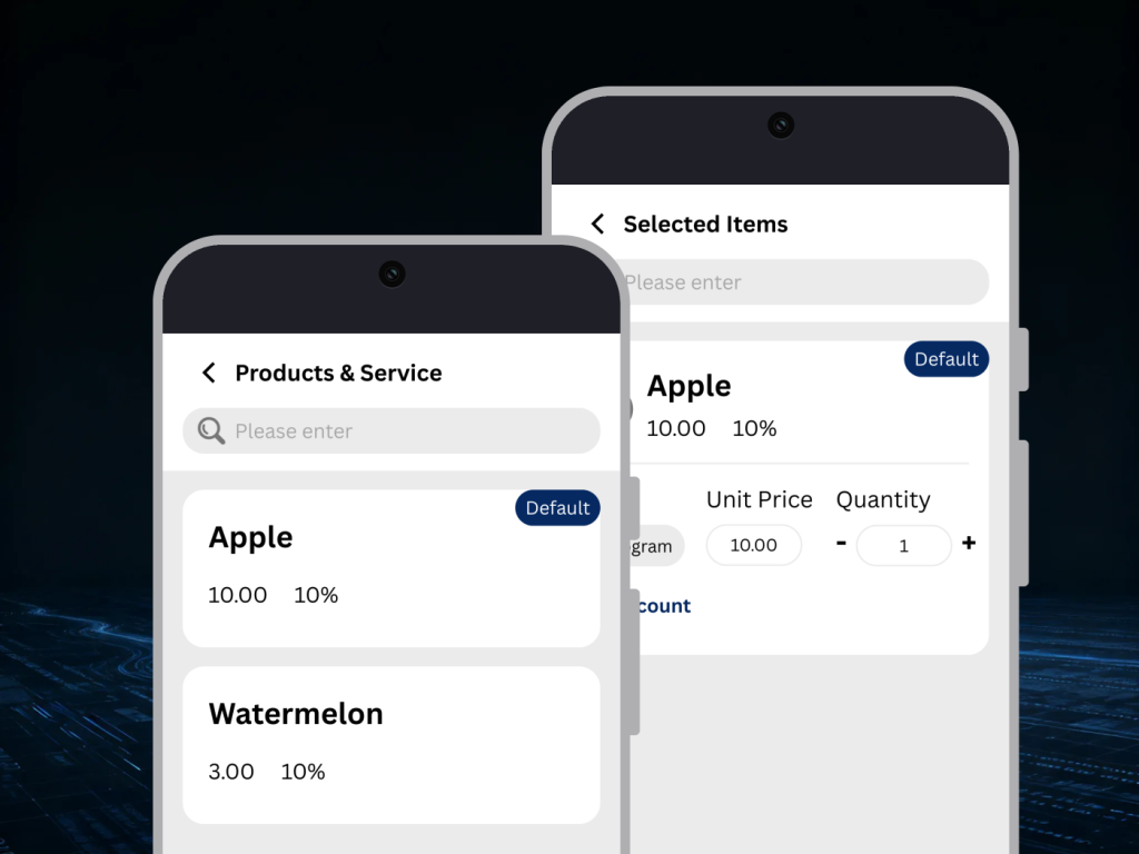 Organize products by category or brand.Set default or highlighted items for efficient workflow.Add, edit, delete, or search products anytime with ease.Support bulk price updates, display product prices, and apply tax rates.Use advanced filters for fast product lookup.