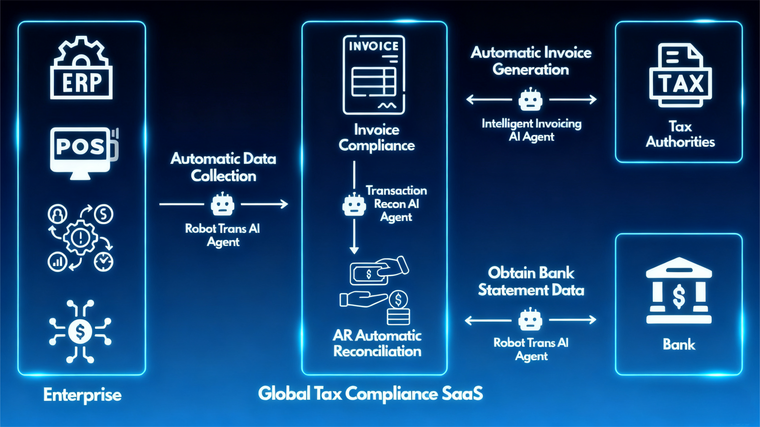 The system is built with multiple AI agents (e.g., “Intelligent Invoicing AI Agent,” “AR Auto-Reconciliation AI Agent”). Each agent is specialized in specific tasks, simulating the work of human experts to enable intelligent processing and decision-making for complex tasks.